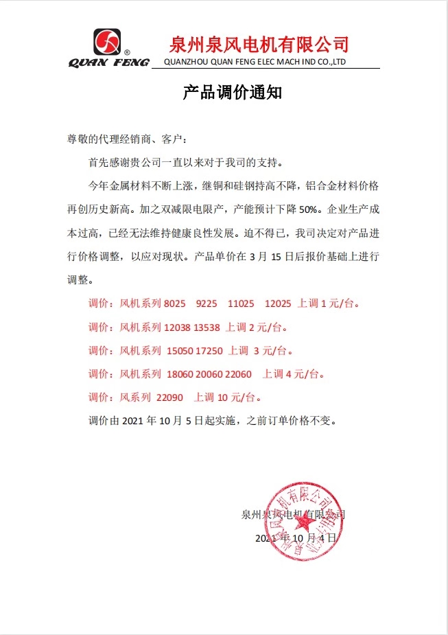 調(diào)價通知:繼2019年12月及2021年3月調(diào)價后,10月份再次調(diào)價